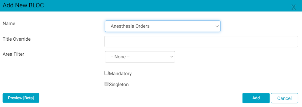 • Tap the Add BLOC button to open the following flyout. Selected the BLOC to add from the drop-down. If desired, enter a Title Override for the BLOC. A Title Override is the name the BLOC will have in the chart. If available and applicable, check whether the BLOC should be mandatory and/or a singleton. If the BLOC being added is the Anesthesia or Physician Orders BLOC an additional field will appear - Area Filter. If an Area Filter is selected, then the BLOC will only display the orders for the selected area – when the BLOC is being added to the Physician or Anesthesia workflow. By default, orders BLOCs only display the orders for the clinical area in which the BLOC is residing (Pre-Op, Intra-Op, etc.).