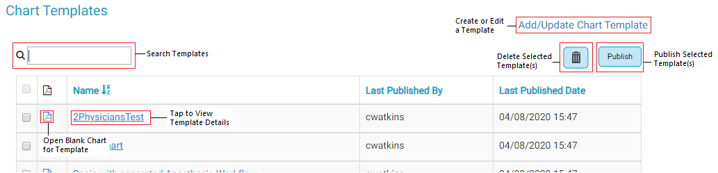 • Tap the PDF icon to the left of the Chart Template Name. Note: If the template has not yet been published there will not be a PDF icon. Select the template and tap the Publish button to create a PDF of the blank chart template.