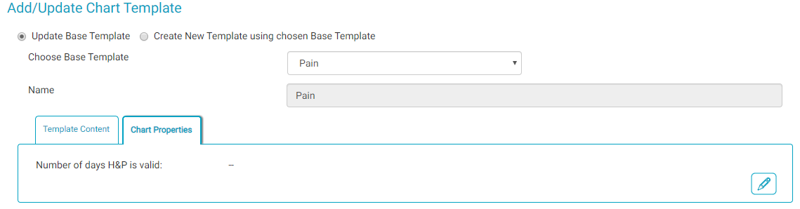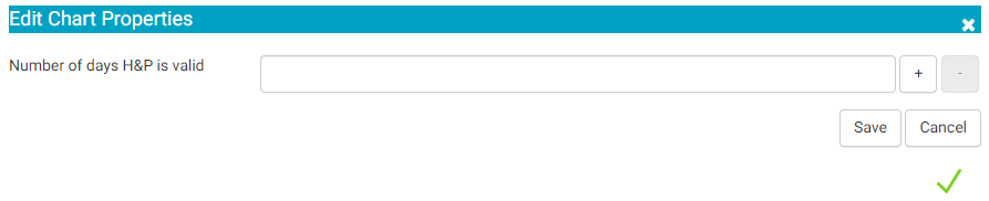 The "Number of days H&P is valid:" setting determines how many days from the date performed a scanned History and Physician is valid. (Only valid H&P documents can be used in the History and Physical Attestation BLOC.) The default value is 30 days. The value can be changed to any value from 1 to 365, but this must be edited in the Add/Update Chart Template page.