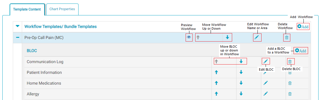 • Use the buttons detailed in the image above to add or remove workflows and BLOCs, rearrange workflows and BLOCs, or edit workflows and BLOCs names.