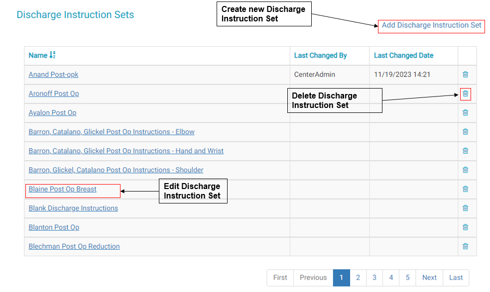 - On the main Discharge Instruction Set page, tap the Delete icon to the right of the Discharge Instruction Set Name to delete it.